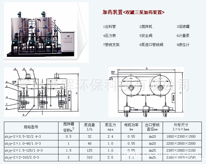 加药装置三种型号,都有三大部分组成:1. 搅拌机 2. 溶液槽 3. 计量装置及投加设置。