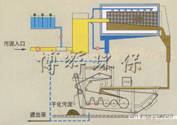 通过污泥变流量泵泥浆先进入混凝给料系统,同时释放后的絮凝剂在变流量药剂泵的作用下也进入系统内然后通过管式水中造粒使污泥与絮凝剂进行充分混合,根据污泥性能调节絮凝剂和污泥混合比,使污泥达到好的凝聚状态,然后进入带式浓缩机,在快速排水机构的作用下,大量的水快速通过网带被滤除,浓缩后的污泥被卸泥装置下到脱水机上重力脱水段,大部分游离水在重力作用下通过网带被滤除,因游离水的分离网带快速被自由状污泥覆盖,上层形成“水池”现象,同时网带向前运行将污泥翻转至下网带重力脱水段,“水池”被翻转到下网带,在重力作用下将原形成的“水池”通过网带被滤除,随着网带的运行污泥进入揳形预压脱水段,污泥在“揳”性挤压段中一方面使污泥平整,另一方面污泥受到轻度挤压开始进行预压脱水。接着进入S形压力脱水段,污泥在S形压力脱水段中被夹在上、下两层滤带中间经若干个由大到小的辊筒反复挤压剪切。污泥在挤压力和剪切力作用下逐步脱水,形成滤饼。接着通过卸料装置将滤饼从滤带上剥离下来,用大于0.5MPa的清水对各滤带进行自动清洗达到滤带再生目的。整个污泥脱水工作全部完成。该设备为24小时连续运行。