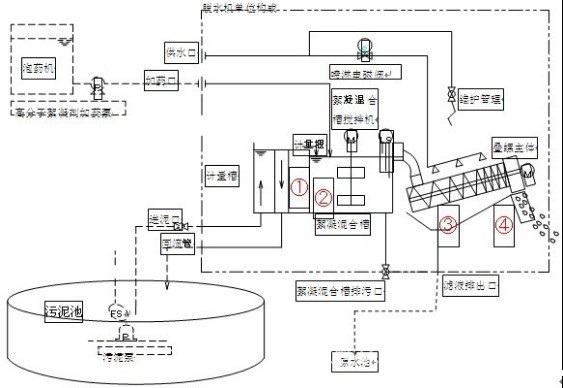 1、通过进泥泵将污泥输送至计量槽流入到絮凝混合槽,多余的部分从溢流管回流到污泥池。滤液从排出口排出。