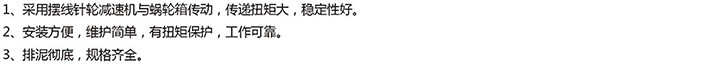 刮吸泥机主要由桥架、减速电机板、吸泥管、中心集泥槽、撇渣装置钢出水槽、出水堰板等作为配套辅件中心回转支承、稳流筒、框架钢结构、臂架、集泥刮就地控制箱等部件组成,并可将钢制进水柱管、不锈驱动装置采用蜗轮减速电机,并内置压簧式过力矩保护机构;驱动电机采用Y型电机,电源为3P、380V、50HZ,防护等级IP55,F级绝缘;在工作时,各吸泥管自成单元,吸泥浓度可通过设在中心集泥槽的流量调节阀控置就地控制箱为户外型,不锈钢外壳,双层门密封,手动和远程控制。