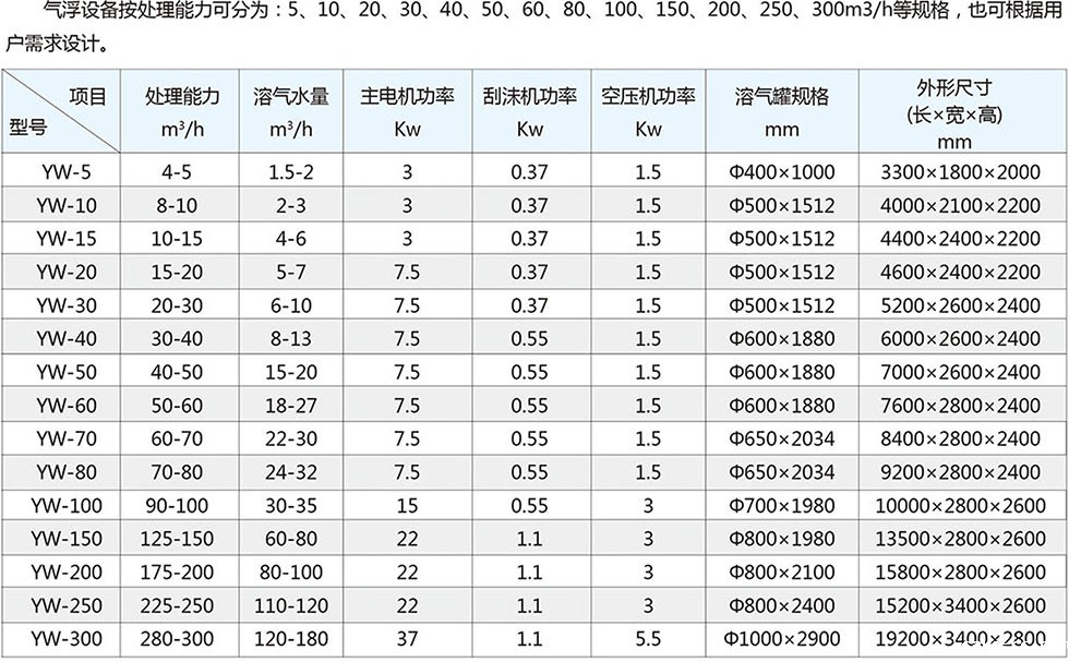 | 备注:考虑运输的方便处理水量超出100m3/h需现场制作,设备外型尺寸可根据用户现场情况定制。 | |||||